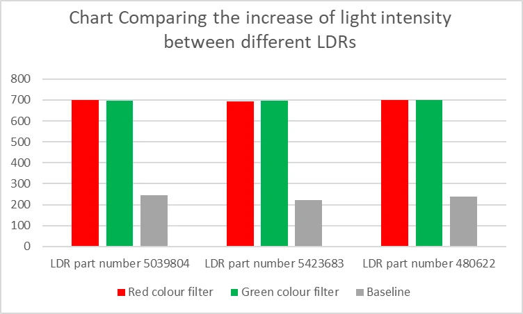 It can be seen from our results that the LDRs achieve similar readings when light is shone on them, but there is nonetheless a clear difference when a desired wavelength is present.